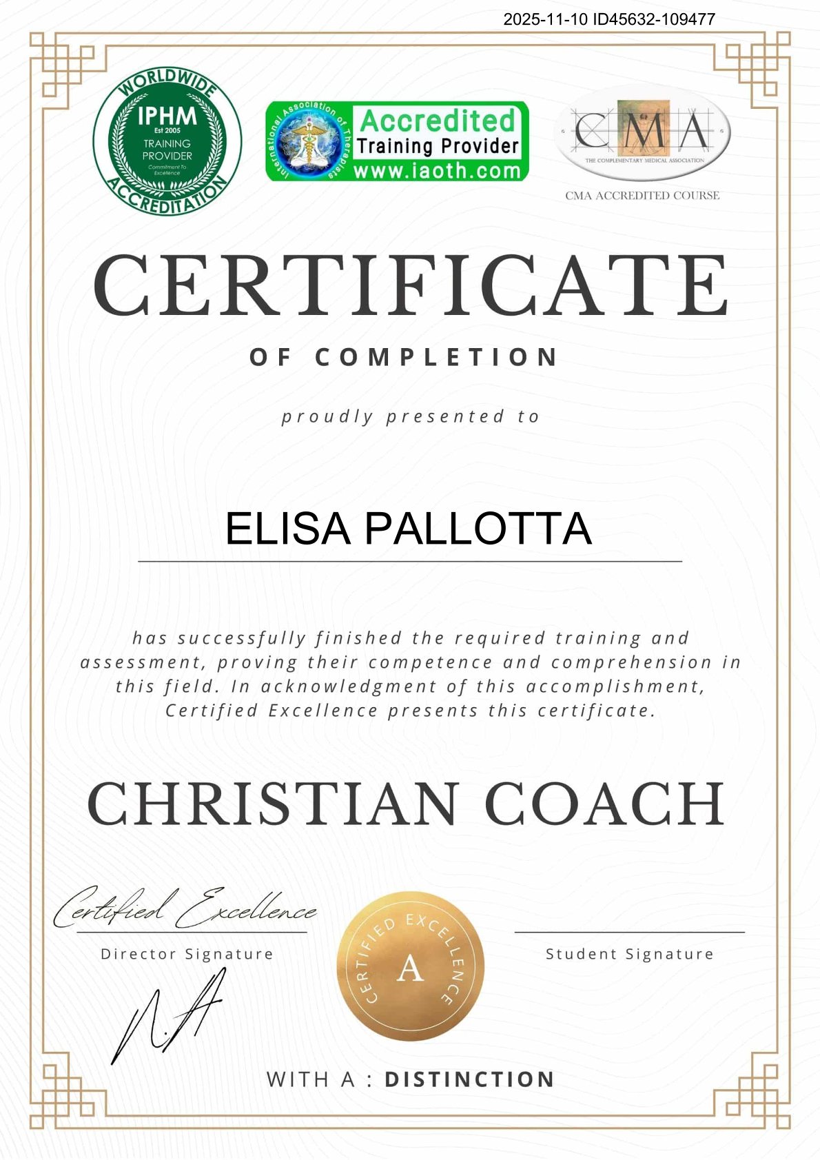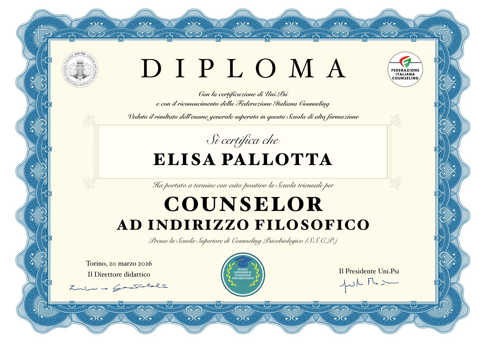 Mi sono formata presso la Scuola Superiore di Counseling Psicobiologico (SSCP), a indirizzo filosofico, riconosciuta dalla Federazione Italiana di Counseling, con un percorso triennale. Mi ha spinto a intraprendere questo percorso la passione per l'umano e il desiderio di porgere un ascolto attivo.